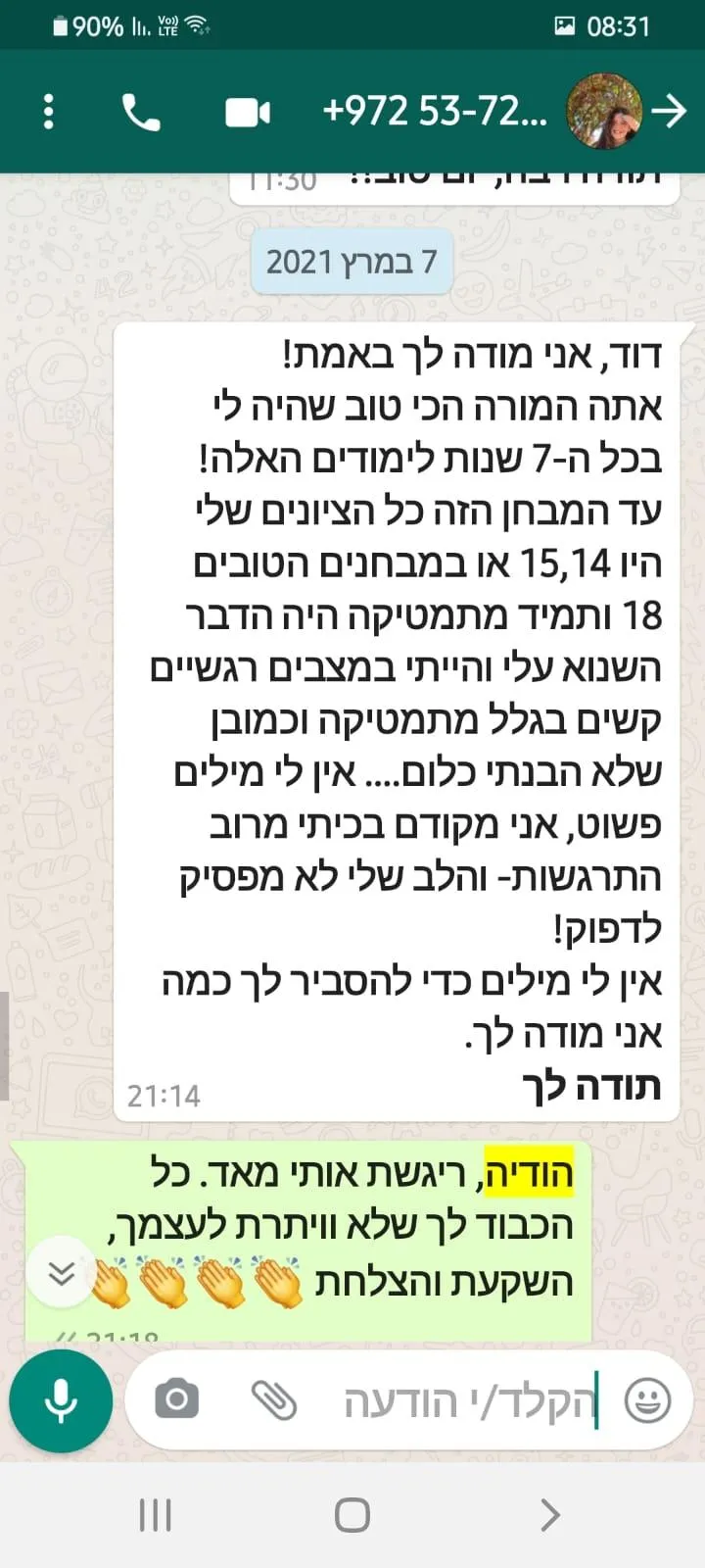 לימדתי בכל הגילאים – מיסודי ועד תיכון, הכנתי אלפי תלמידים לאינספור מבחנים ובגרויות, ותמיד עם דגש אחד ברור: התאמה אישית של תהליכי הלמידה לכל תלמיד ותלמיד